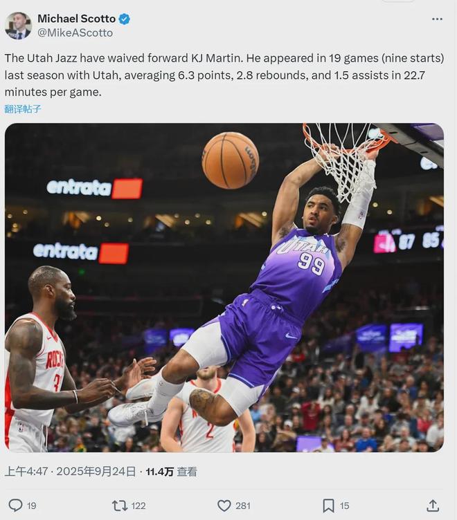 北京时间9月24日,据NBA记者Michael Scotto报道,犹他爵士队正式裁掉小肯扬-马丁,他将进入自由市场寻求新的机会。目前并没有球队表达出对小马丁的兴趣,他很难找到下家。小马丁原