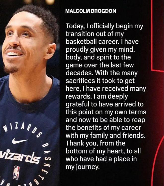 距离 NBA 新赛季开幕仅剩 6 天,一则突发消息震惊联盟,据名记沙姆斯·查拉尼亚报道,球队后卫马尔科姆·布罗格登通过ESPN正式宣布退役决定,结束自己长达九年的NBA职业生涯。这一