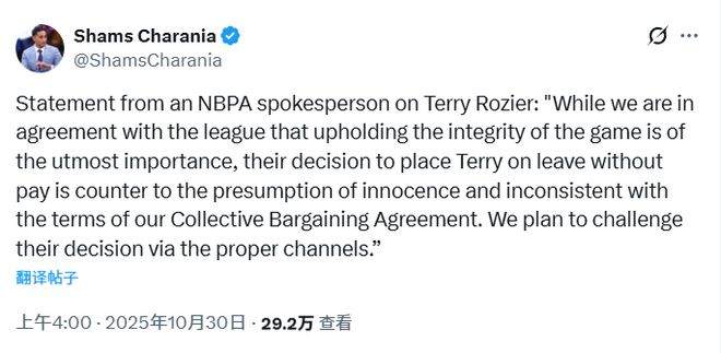 球员工会的一位发言人表示:“尽管我们与联盟一致认为维护比赛公正性至关重要,但他们让特里停薪的决定,既违背了无罪推定原则,也与劳资协议的条款不符。我们计划通过正当渠道对这一决定提出异议。”