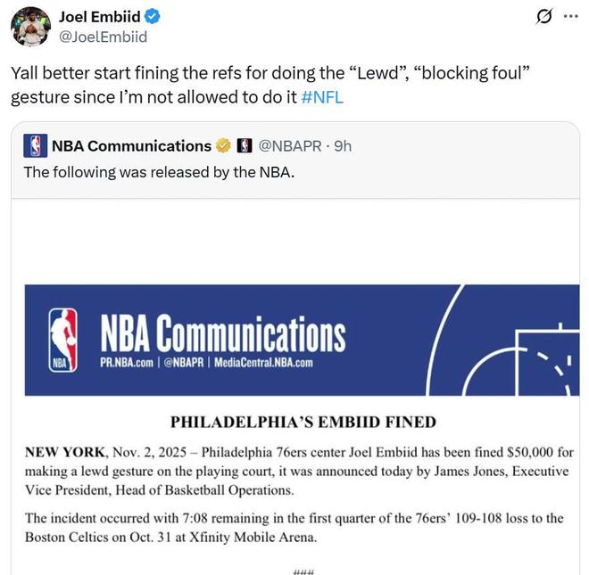 结果恩比德依旧不服,直接转发NBA的处罚报告,正面回怼道:“你们最好对裁判做出的那种下流阻挡犯规动作做出处罚,毕竟我没有被允许做这一动作。”