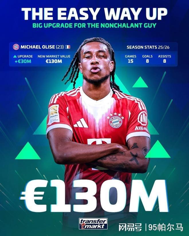 据悉,在最新一期的德甲球员身价榜上,拜仁的17号身价高达1.3亿欧元,仅次于穆西亚拉,并且涨幅达到3000万欧元。《德转》的权威性不言而喻,用市场调查员的话说:“奥利塞现在是世界上最好的球员之一。”