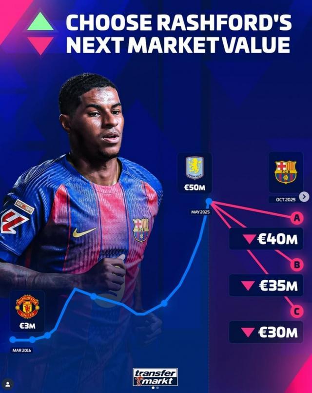 拉什福德目前身价为5000万欧,德转给出他在更新后的身价选项分别有4000万欧、3500万欧以及3000万欧。