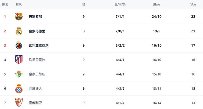 在积分榜,巴萨以22分暂时登上了榜首位置。21分的皇马掉到第2名。不过,皇马比巴萨少踢1场。只要接下来的比赛皇马获胜,就能够重夺榜首。比利亚雷亚尔以17分排名第3。赢球的马竞总积分达到16分排名第4。皇家贝蒂斯也是16分,排名第5。