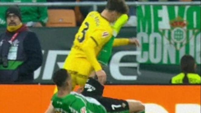 比赛进行到第91分钟,主裁判奥斯·加莱奇中断比赛,亲自到场边观看VAR回放,复核安东尼与赫罗纳3号球员霍埃尔·罗卡之间的冲突。慢镜头显示,安东尼在一次争抢中腾空飞踹,但并未触到皮球,而是直接踢中了对方脸部。