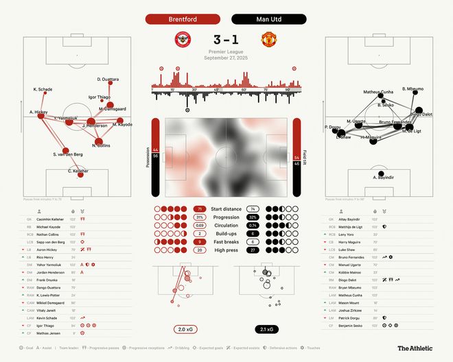 伊戈尔-蒂亚戈的第二个进球同样是一次防守端的混乱,但这也反映了曼联整体表现的糟糕。几乎每次布伦特福德进攻时,他们都显得接近破门。事实上,曼联本场比赛为数不多的亮点之一是巴因迪尔在处理高空球时的表现。而当守门员处理高空球的能力成为亮点时,你就知道这是一场多么糟糕的比赛。