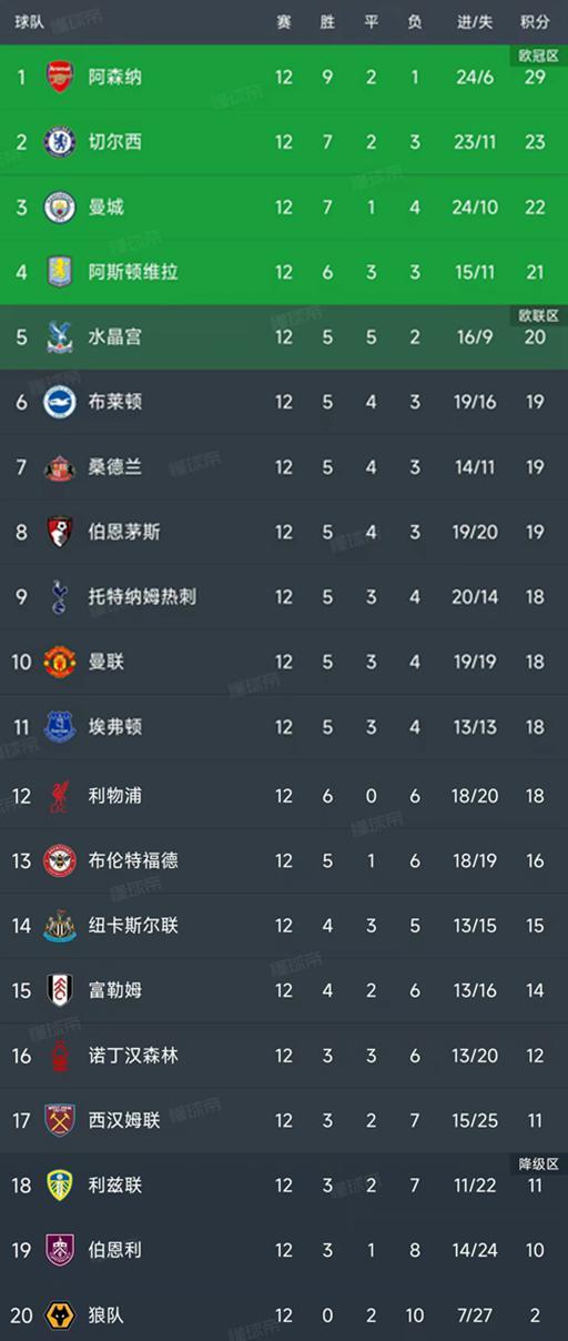 随着曼联01埃弗顿,英超第12轮结束了所有比赛,最新积分榜如下