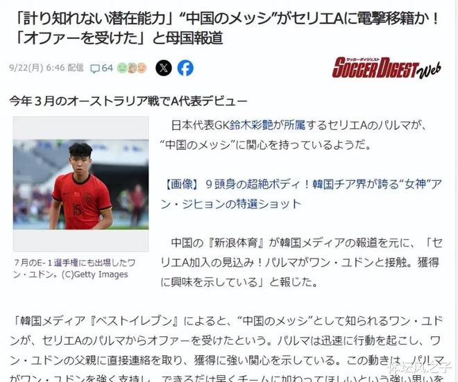 就在近日,关于王钰栋留洋也是有好消息传来,日本媒体就率先披露了,中国年轻前锋王钰栋可能加盟意甲帕尔马的消息,并且表示帕尔马已向浙江队发出报价,并直接联系王钰栋父亲表明意愿,而且随后韩国媒体方面也进行了跟进报道,这件事情在国内则是引发了球迷的广泛关注,球迷也是期待能够有中国球员再次登上五大联赛的舞台。